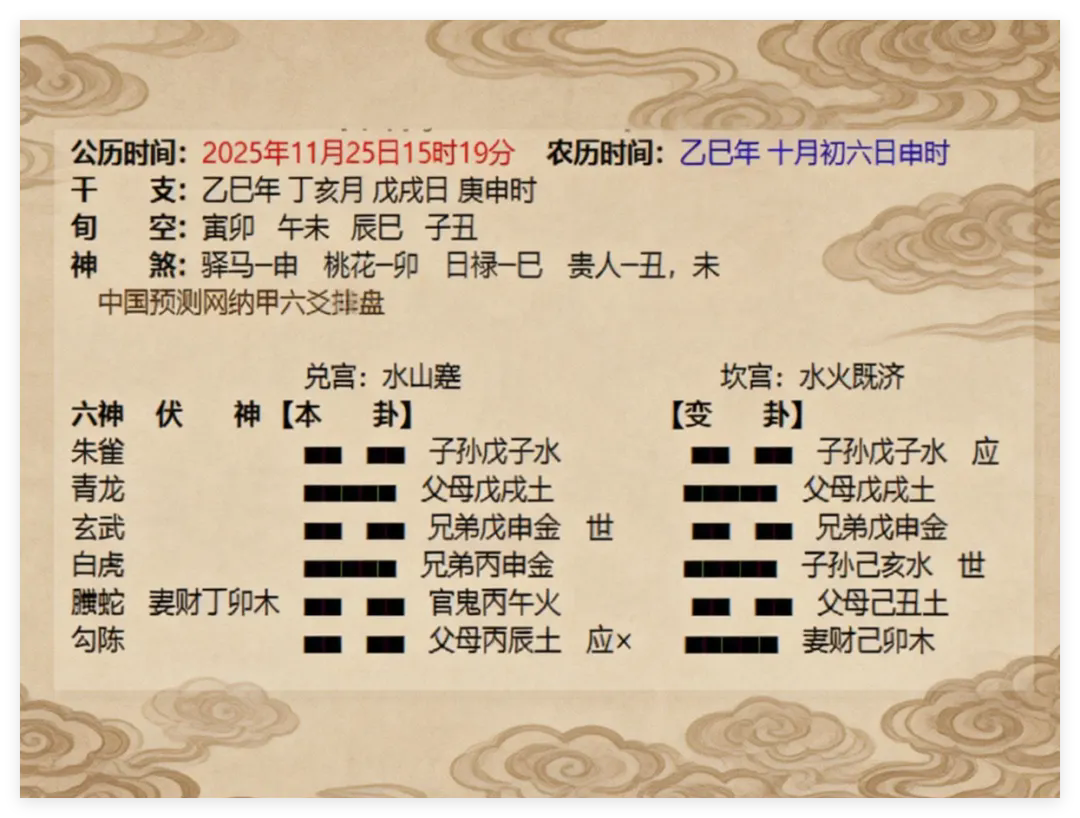 最值得玩味的是六爻子孙子水临朱雀安静而旺。此象预示着2026年我国在对外交往中,将更多采用沟通协商、说理说服的方式处理国际事务,以软实力化解分歧,以话语权凝聚共识。而卦中离火偏弱、兑金不显,更印证了战争风险的低微。