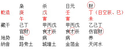 此外,命局里,天干+地支合计有4个以上的正+偏财,为财重(如图)。